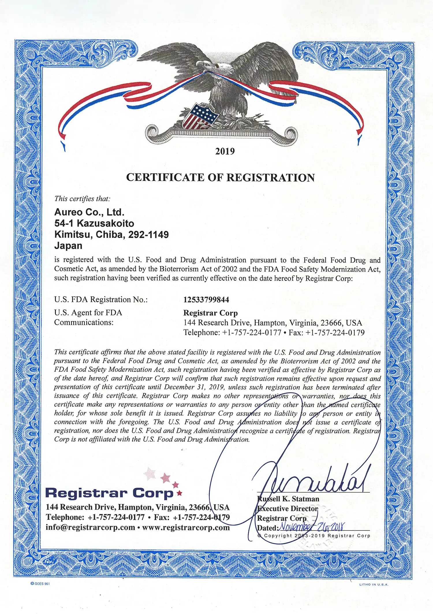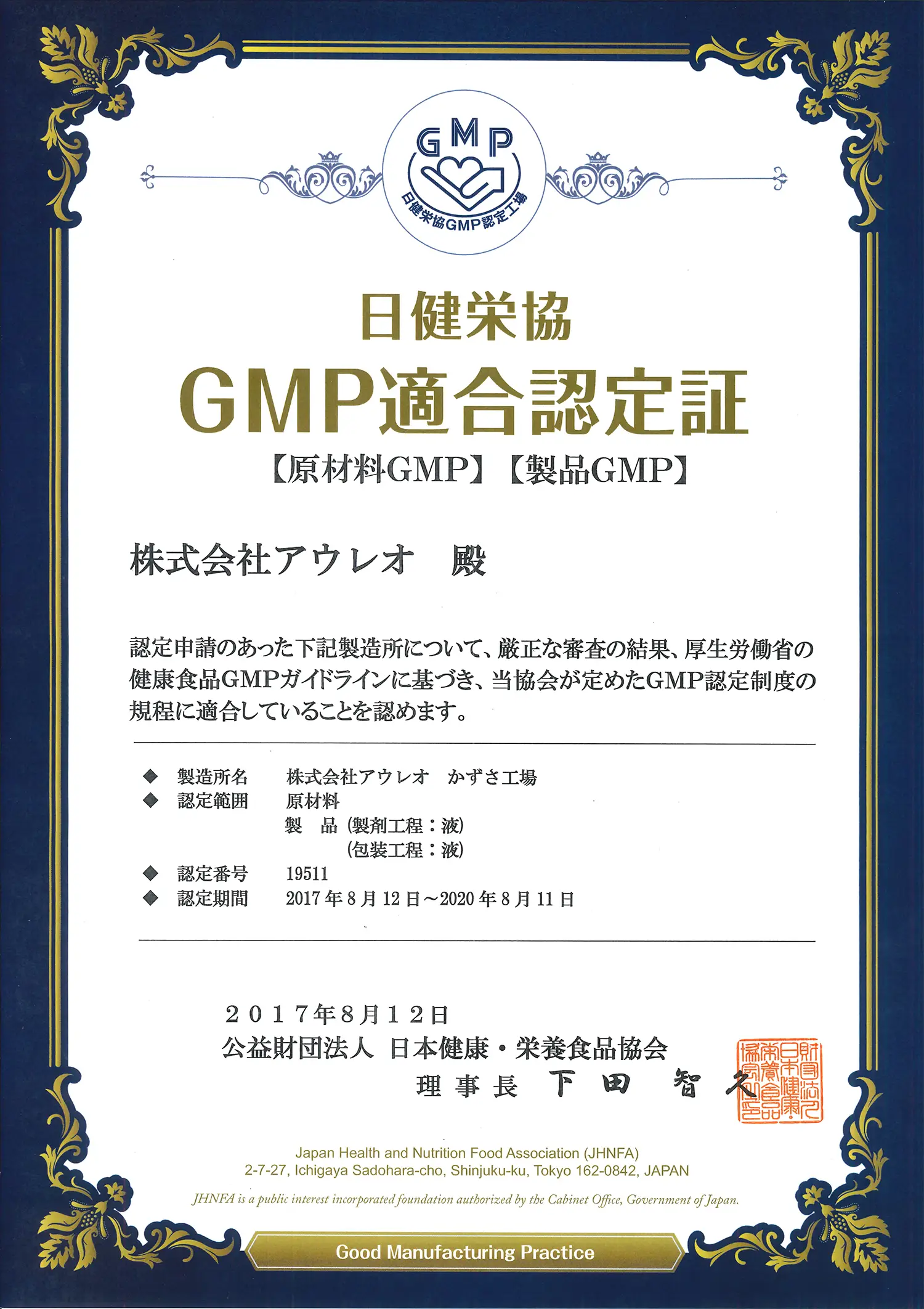 從原材料到最終出貨,嚴格的管理和產品的品質得到了認可,並獲得了符合膳食補充劑GMP*的認證(2011年8月),引入了HACCP(食品衛生管理系統),並獲得了其他認證,如在美國(根據《生物恐怖主義法》進行工廠註冊)和穆斯林國家(英國清真協會的清真認證)。